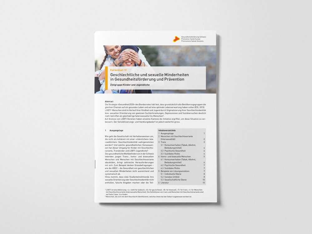 In diesem Faktenblatt stellt Gesundheitsförderung Schweiz eine Bestandsaufnahme der Situationen von homo-, bi-, trans* und intersexuellen Kindern und Jugendlichen bezüglich Suchtverhalten, Depression und Suizidverhalten vor.